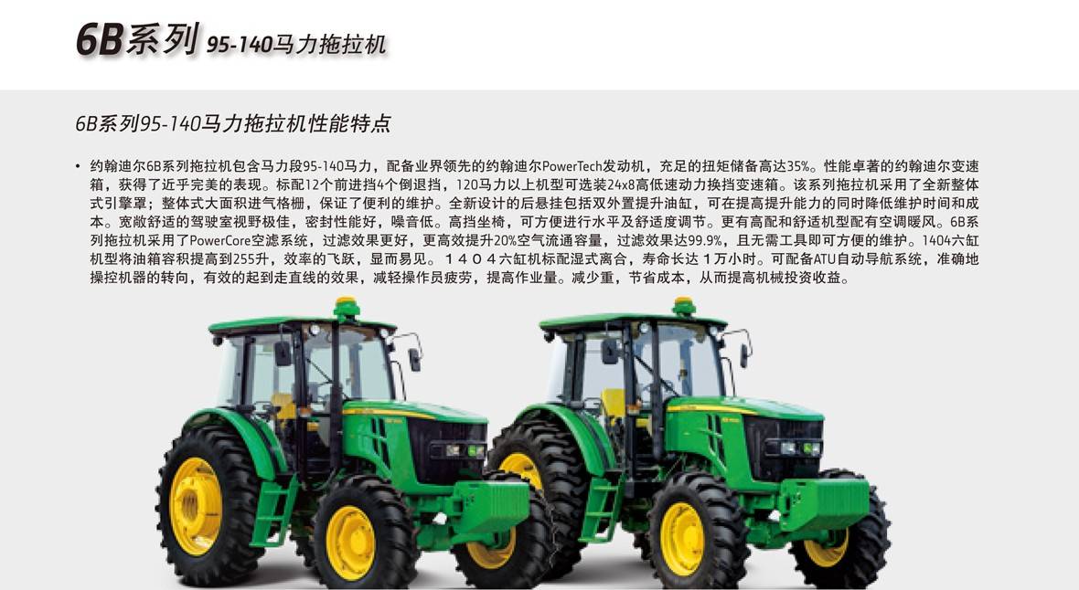 約翰迪爾6B系列拖拉機(jī)包含馬力段95-140馬力,配備業(yè)界領(lǐng)先的約翰迪爾PowerTech發(fā)動(dòng)機(jī),充足的扭矩儲(chǔ)備高達(dá)35%。性能卓著的約翰迪爾變速箱,獲得了近乎完美的表現(xiàn)。