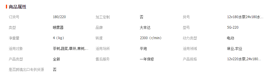 歡迎光臨,這是一款型號180/220五缸隔膜泵,常規(guī)有12v,48v,60v,還可以定做24v,36v,72v,水泵接口進(jìn)水為內(nèi)螺紋1/2,配一個外牙四分插14的塑料接頭,出水螺紋為內(nèi)牙1/2,配一個四分轉(zhuǎn)14*1.5的銅接頭,水泵壓力1.5mpa,流量每分鐘18L,單水泵重量4公斤,加配件5