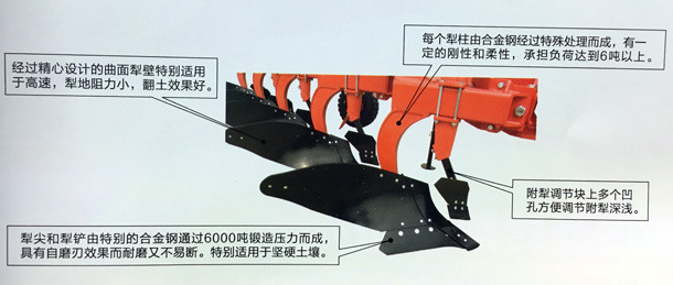 全懸掛式;安全螺栓保護系統(tǒng);高強度犁框架;犁地入土傾角可調(diào),自磨刃口式犁鏟,可拆換方便;有5檔作業(yè) 幅度可調(diào);限深輪和運輸輪合用。