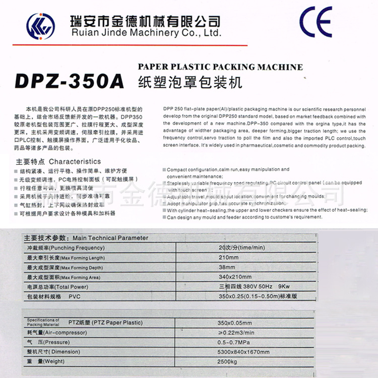 詳細(xì)信息 加工定制是 功能包裝容器成型 品牌金德 型號(hào)DPZ-350 電壓380(V) 功率9(Kw) 包裝膜寬350*0.20*0.35(mm) 制成袋尺寸340*210*38(mm) 包裝速度20(袋/分鐘) 重量2500(kg) 外形尺寸5300*840*1670(mm) 包裝材料塑料 包裝類型牙刷包裝 自動(dòng)化程度全自動(dòng) 適用對(duì)象化妝品類,護(hù)發(fā)用品,護(hù)膚品