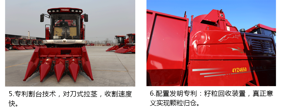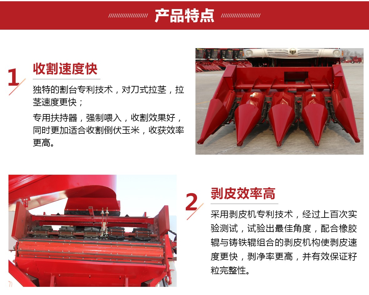 ◆ 割臺(tái)專利技術(shù),對(duì)刀式拉莖,拉莖速度快;專用扶持器,強(qiáng)制喂入,更加適合收割倒伏玉米,收獲效率更高;
