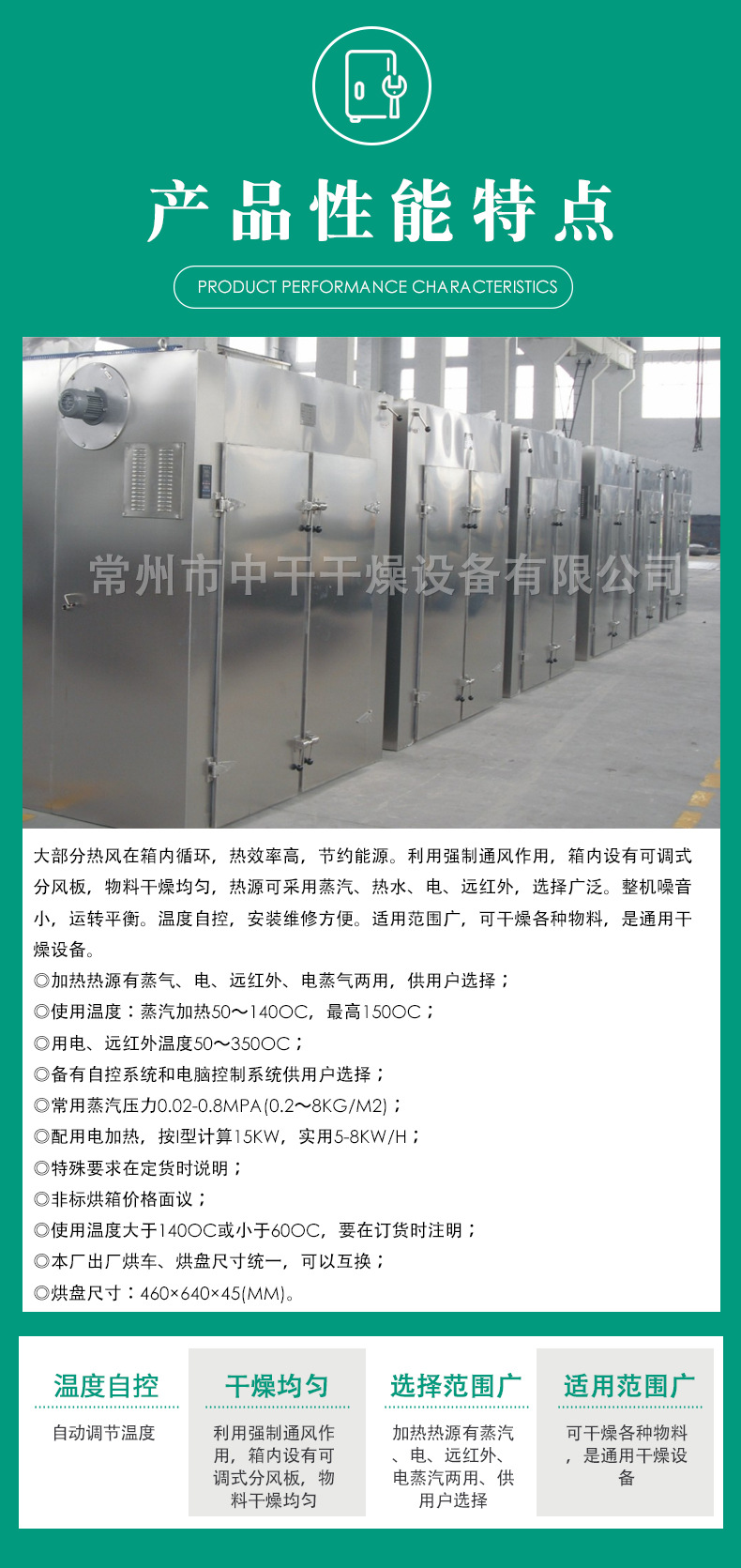 詳細信息 訂貨號烘干機 加工定制是 貨號ZG-2 品牌中干干燥 型號CT-C 操作方式間歇式 適用物料多種可用 應(yīng)用領(lǐng)域食品 醫(yī)藥 化工 傳熱面積5-100(m2) 轉(zhuǎn)速0(r/min) 功率15(kw) 外形尺寸2.3*1.4*2.3(m) 占地面積5(m2) 重量870(kg) 是否跨境出口專供貨源否