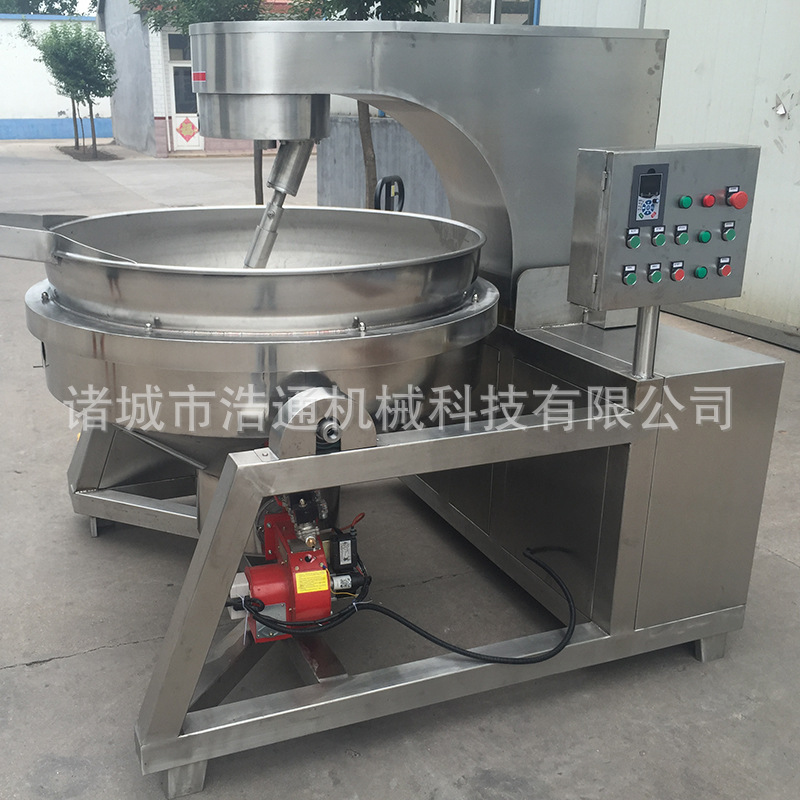 本產(chǎn)品鍋體為一次沖壓成型的球形不銹鋼鍋體,采用燃?xì)饧訜嵝问?,外保溫層采用硅酸鋁材質(zhì),耐火耐高溫,保證加熱能量不損耗;攪拌方式采用特殊的傾斜式傳動,使用的行星式攪拌器與鍋體充分接觸,多個攪拌齒,實現(xiàn)傳動公轉(zhuǎn)與自轉(zhuǎn)的不整數(shù)傳動比,使鍋內(nèi)無攪拌死角。使用先進(jìn)的傳動與密封結(jié)構(gòu),使傳動部分與鍋內(nèi)潔凈、衛(wèi)生。采用變頻調(diào)速動力,運行更平穩(wěn)。本機(jī)采用全自動液壓翻鍋運料,降低成本,是性能優(yōu)良的食品加工設(shè)備。