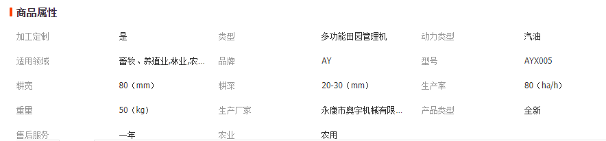 最大輸出:6.5HP/3600轉(zhuǎn) 耕寬:80CM 耕深:20-30CM 毛重/凈重:55/50KGS 包裝:1臺(tái) 尺寸:74*44*63CM |