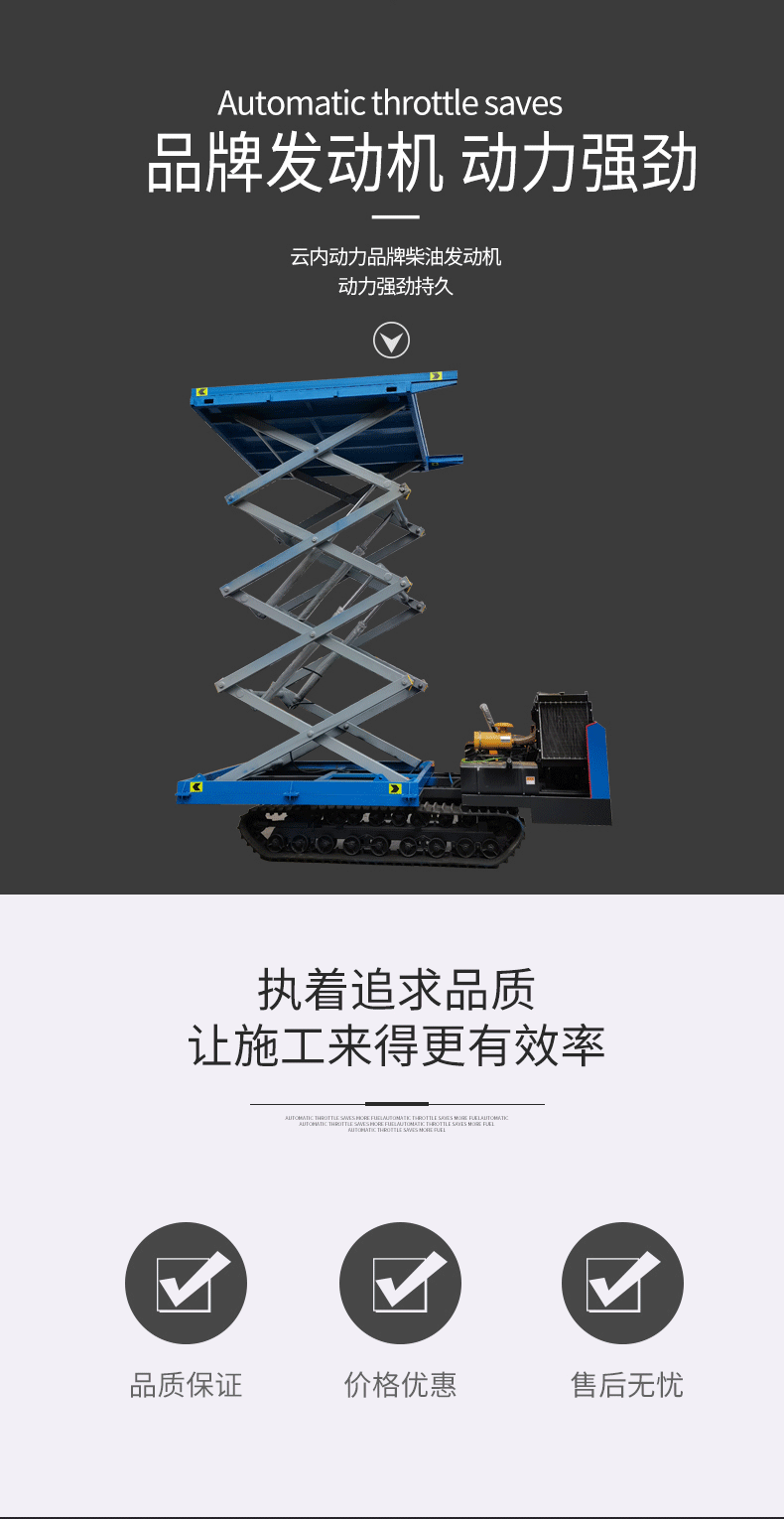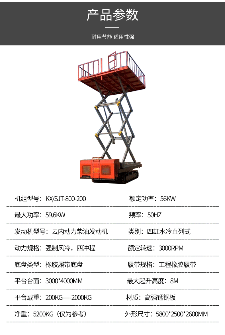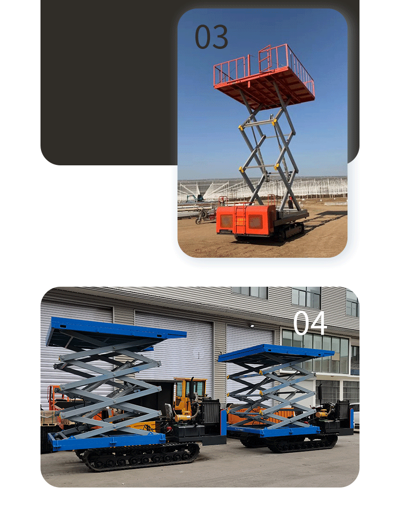 詳細(xì)信息 產(chǎn)地山東濟寧 是否進口否 訂貨號593 品牌凱信 型號8米升降臺 貨號593 類型液壓升降臺 加工定制是 整機重量4200(kg) 額定載荷2000(kg) 最低高度2300(mm) 最大寬度2500(mm) 電動功率56(KW) 材質(zhì)金屬 電源電壓380V 本產(chǎn)品價格、參數(shù)僅供參考,具體詳詢電話:178-6130-0705 履帶式升降平臺 10米戶外操作履帶平臺 坑洼路面用升降機