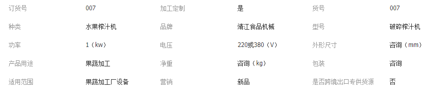 該機用于所有果蔬(核果須經(jīng)去核)的榨汁,適用于生姜、麥苗等物料的破碎榨汁。