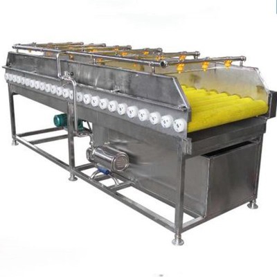 毛輥在電機(jī)的帶動(dòng)下通過(guò)相對(duì)逆向滾動(dòng),與產(chǎn)品直接接觸產(chǎn)生摩擦達(dá)到清洗效果;并設(shè)有特制的自動(dòng)高壓噴淋?chē)婎^進(jìn)行沖洗,即可達(dá)到產(chǎn)品清洗的效果;毛輥清洗機(jī)可根據(jù)產(chǎn)品需要加裝不同的毛刷輥,山藥清洗適宜選用絲質(zhì)較軟的毛刷輥,以免對(duì)山藥表皮造成擦傷,軟毛刷清洗可達(dá)到對(duì)果蔬上臘拋光的作用。并要注意的是,工作時(shí)要先開(kāi)機(jī)運(yùn)行后再投料,這樣可以延長(zhǎng)電機(jī)壽命,減少電機(jī)損壞的機(jī)率。