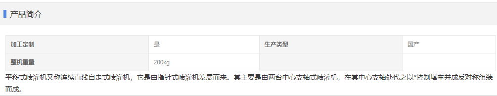 的特點(diǎn)主要為產(chǎn)品自動(dòng)化程度高,可用電能或柴油發(fā)電機(jī)組為其提供驅(qū)動(dòng)力,其電器控制系統(tǒng)安全可靠,具有過(guò)雨量保護(hù)、自動(dòng)導(dǎo)向系統(tǒng)、低頭自動(dòng)停機(jī)系統(tǒng)和故障自動(dòng)報(bào)警系統(tǒng);同時(shí)產(chǎn)品灌水均勻度高,同機(jī)比指針式控制面積大,噴灌效率更高;且適合矩形農(nóng)田。平移式噴灌機(jī)相對(duì)的弱項(xiàng)為爬坡能力比較低,導(dǎo)向難度大,適合地面較平整,精耕細(xì)作的農(nóng)業(yè)區(qū)或牧區(qū)。
