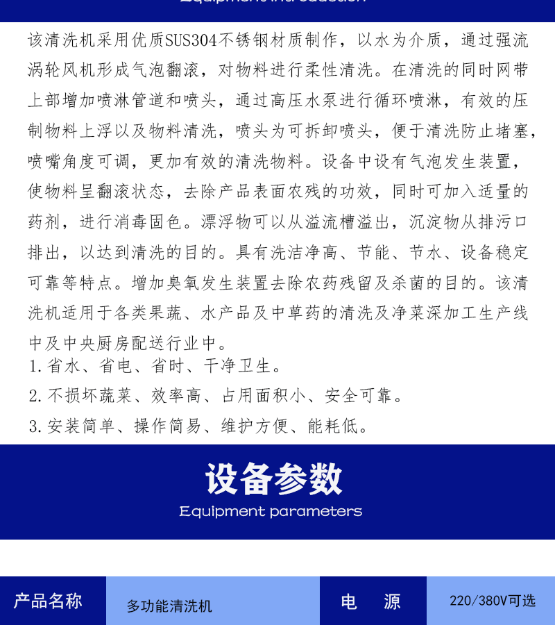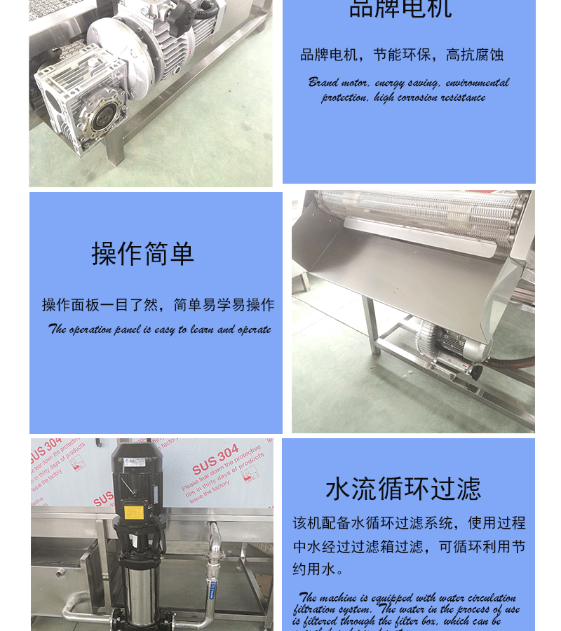 1、設(shè)備除電機(jī)、軸承等標(biāo)準(zhǔn)件外均采用不銹鋼SUS304/2B材料制作,完全符合出口食品衛(wèi)生要求。設(shè)備中設(shè)有氣泡發(fā)生裝置,使物料呈翻滾狀態(tài),具有洗潔凈高、節(jié)能、節(jié)水、設(shè)備穩(wěn)定可靠等特點(diǎn)。