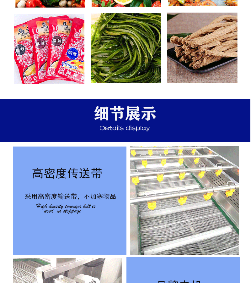 2、本機(jī)輸送部分采用SUS304不銹鋼網(wǎng)帶,運(yùn)行平穩(wěn)、使用壽命長(zhǎng)等特點(diǎn),符合食品衛(wèi)生要求。