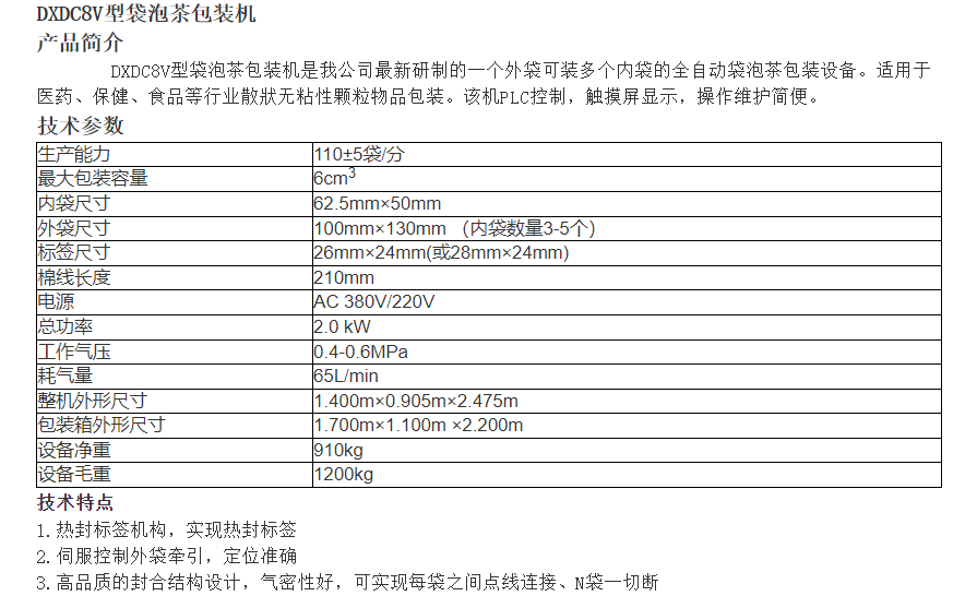 內外袋一次成型 115袋/分鐘南峰(NF)牌DXDC8V型袋泡茶包裝機