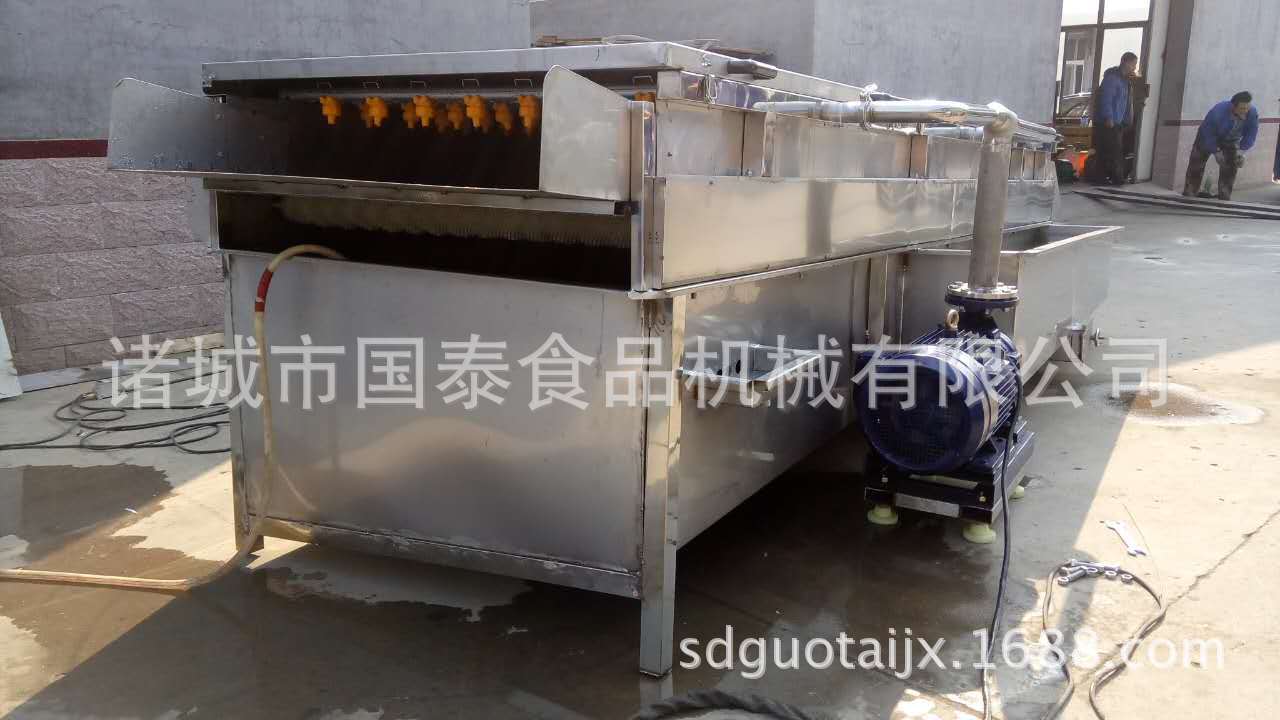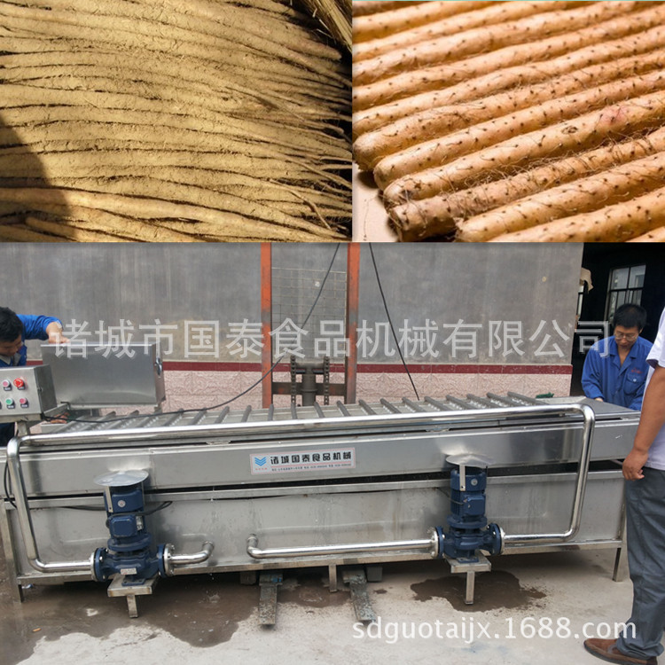 山藥毛輥清洗去雜機(jī)采用SUS304不銹鋼制做,設(shè)備上部有高壓噴淋對(duì)果蔬表面進(jìn)行沖洗可有效的洗去表面粘有的泥沙、中間有毛輥,通過(guò)毛輥的轉(zhuǎn)動(dòng)帶動(dòng)果蔬的前進(jìn),并對(duì)物料的表面進(jìn)行刷洗可深層清洗果蔬表面粘連的不易沖洗的雜物,毛輥采用雙層毛刷可以將表面的毛發(fā)和纖維物的清除。經(jīng)毛輥清洗去雜機(jī)去除毛發(fā)及纖維雜物后,提高了果蔬的潔凈率。下部可進(jìn)行水收集使之能循環(huán)利用,節(jié)約了成本。