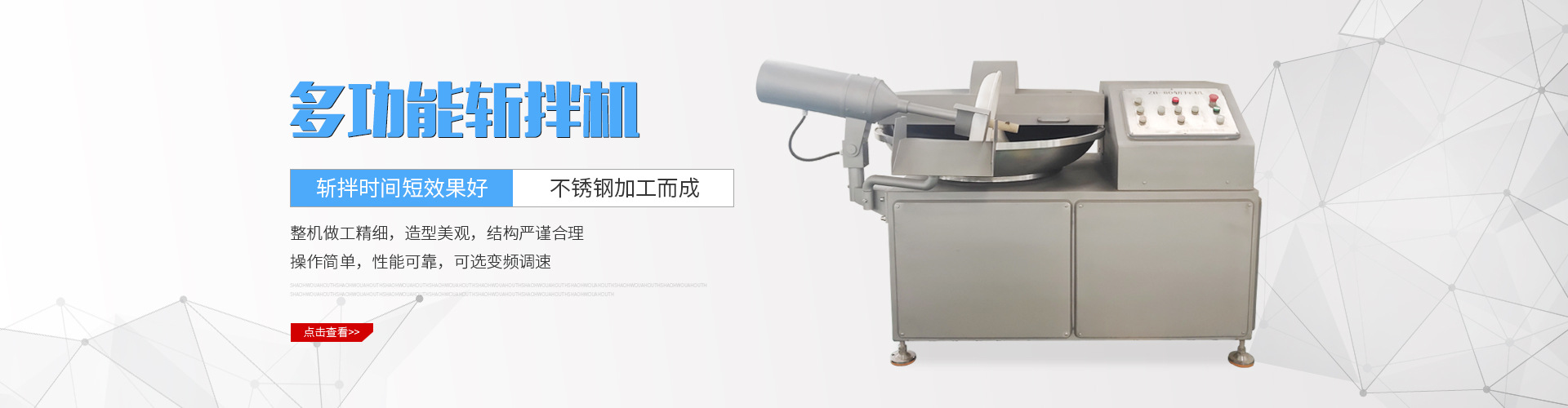 山東鼎益嘉食品機械有限公司坐落于中國恐龍之鄉(xiāng)山東省諸城市,被譽為“中國龍城、舜帝故里”交通便利,物流快捷。公司著眼于未來,不斷創(chuàng)造新的技術(shù)與工藝,以幫助我們用戶贏得未來充滿競爭的挑戰(zhàn),全心全意服務(wù)于廣大新老客戶,為社會盡一個企業(yè)應(yīng)盡的責(zé)任。以穩(wěn)定質(zhì)量的產(chǎn)品、合理的價格、熱誠的服務(wù)、專注為客戶提供優(yōu)良的食品機械。 公司主要主要生產(chǎn)適合客戶需要的真空包裝機,滾揉機,斬拌機,強流風(fēng)干機,果蔬清洗機,巴氏滅菌機,提升機,鹽水注射機,丸子機,絞肉機,灌腸機,拌料機,拌餡機,刨肉機等,產(chǎn)品質(zhì)量穩(wěn)定,可廣泛應(yīng)用于肉類、水產(chǎn)類、速凍食品、調(diào)理食品等諸多食品行業(yè)。 公司以“科技鑄就產(chǎn)品,誠信贏得市場”為經(jīng)營理念,客戶需求是我們持續(xù)改進的動力。我們堅持不懈努力為客戶嚴(yán)抓產(chǎn)品質(zhì)量,提供出色的產(chǎn)品和服務(wù)。 [詳細(xì)介紹]