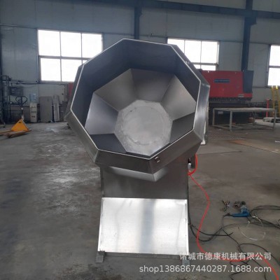 采用減速電機(jī),齒輪傳動(dòng),使油炸的食品不破碎,自動(dòng)攪拌、拌料均勻、操作方便、產(chǎn)量高、不銹鋼制作、滾桶的轉(zhuǎn)速和傾斜度都可以調(diào)節(jié)、給粉量也可以控制、可以對(duì)食品進(jìn)行調(diào)味、拌料。根據(jù)油炸食品的形狀特點(diǎn)設(shè)計(jì)制造的,是油炸食品調(diào)味、拌料設(shè)備,八角拌料機(jī)結(jié)構(gòu)簡(jiǎn)單實(shí)用,主要用于食品的后期調(diào)味粉的攪拌或原料的裹粉包衣以及摻和,桶體為不銹鋼八角型設(shè)計(jì),避免了圓球拌料桶原料不翻動(dòng),拌料不均勻的弊端,能在較短時(shí)間內(nèi)使待加工食品物料與所需調(diào)料充分拌合均勻,自動(dòng)傾斜把食品物料送出筒外。達(dá)到自動(dòng)拌勻,自動(dòng)出料,清理消毒方便無死角。