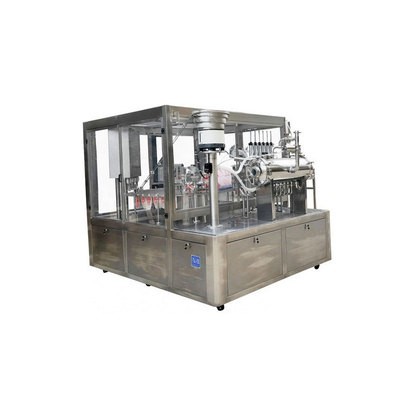 特點:本機(jī)從自動定位—自動吹氣—自動定量兩次灌裝—自動清洗—自動下蓋—自動旋蓋—自動出袋