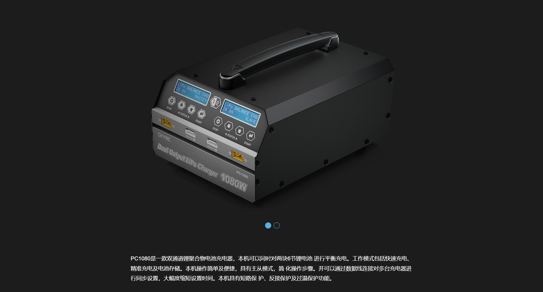 PC1080是一款雙通道鋰聚合物電池充電器,可以同時(shí)對(duì)兩塊6節(jié)鋰聚合物電池/高壓鋰電池 進(jìn)行平衡充電。工作模式包括快速充電、精準(zhǔn)充電及存儲(chǔ)模式。本機(jī)操作簡(jiǎn)單,具有主從模式。并可以通過(guò)數(shù)據(jù)線連接對(duì)多臺(tái)充電器進(jìn)行同步設(shè)置,大幅度縮短設(shè)置時(shí)間。本機(jī)具有短路保 護(hù)、反接保護(hù)及過(guò)溫保護(hù)功能。